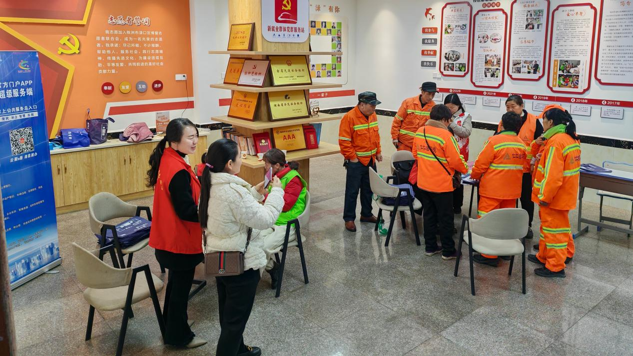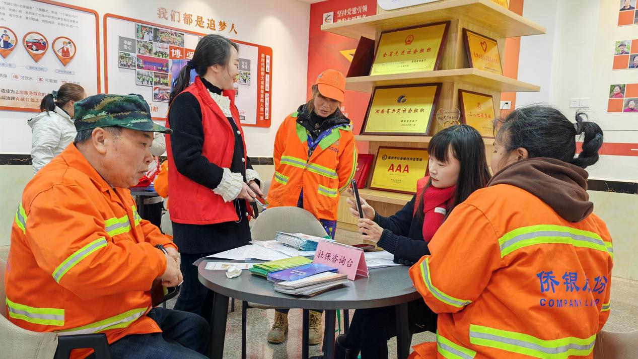 为方便环卫工人直观了解养老、医疗保险等相关知识,1月12日清晨,渌口区政务服务中心抽派精干业务人员到环卫工人驿站,利用集中用餐间隙,开展“送政策、 送服务、送温暖 ”的志愿活动,把服务送到群众的心坎上。