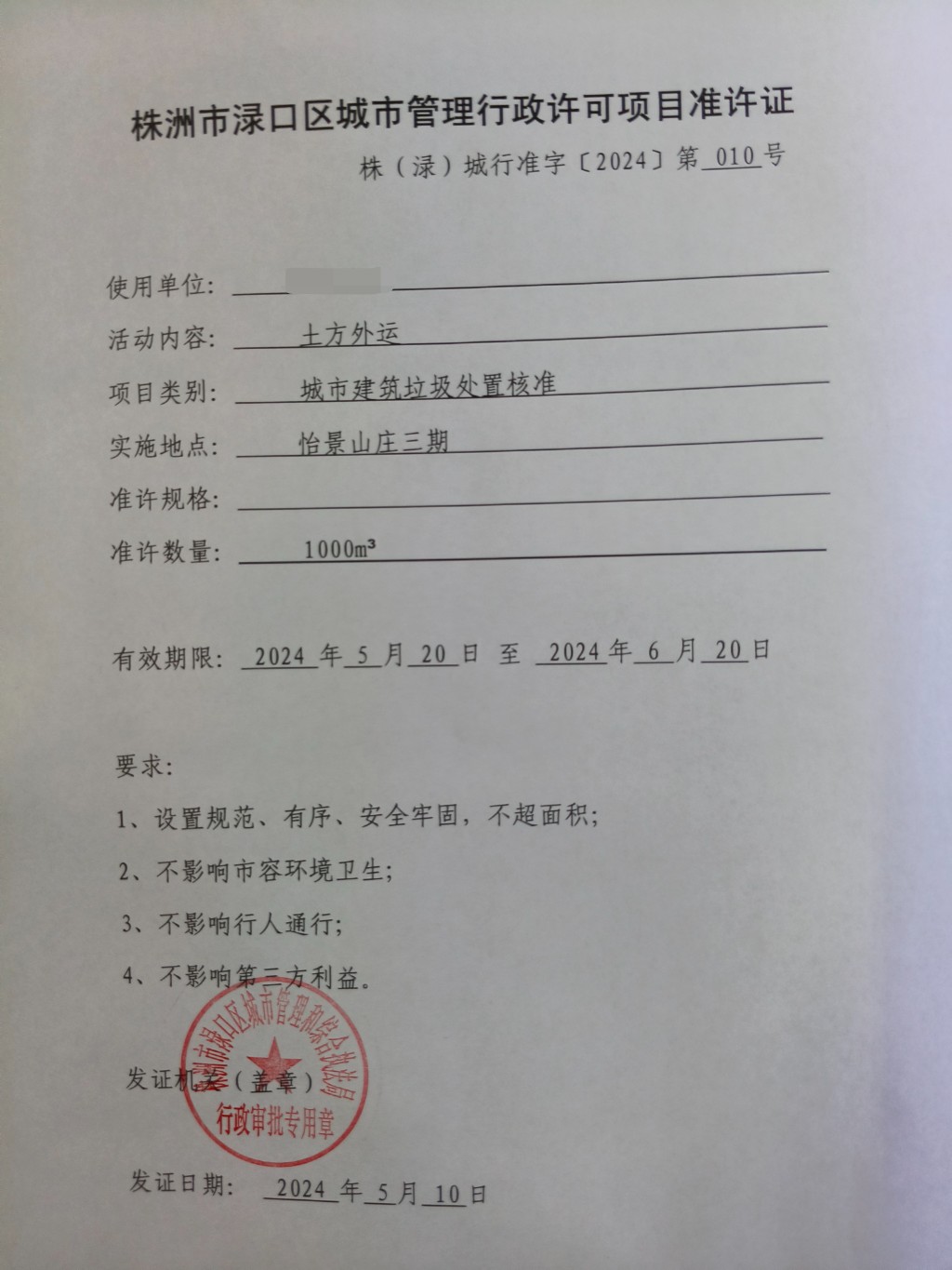 株洲市渌口区城市管理行政许可项目准许证株(渌)城行准字【2024】第010号