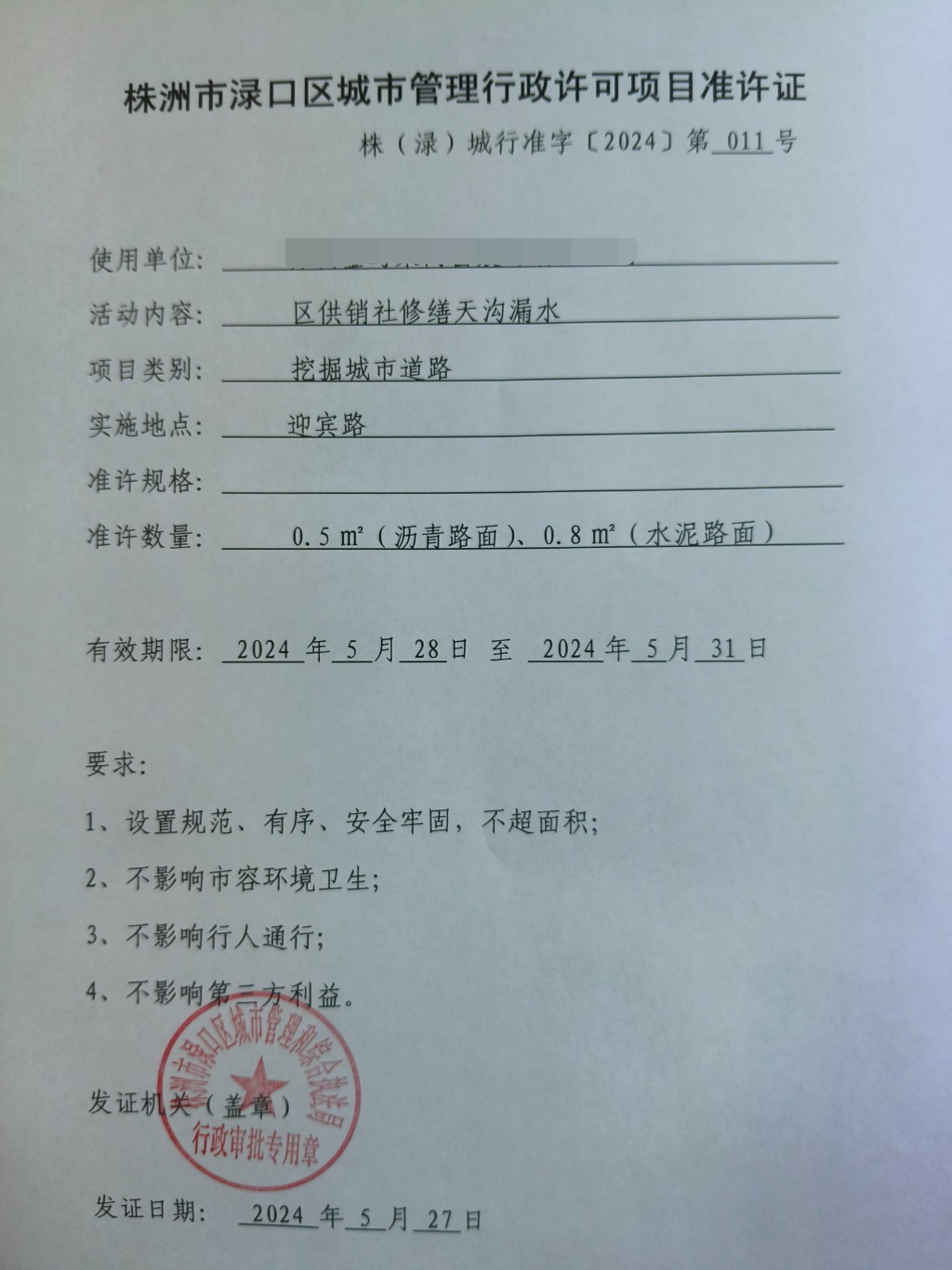 株洲市渌口区城市管理行政许可项目准许证株(渌)城行准字【2024】第011号