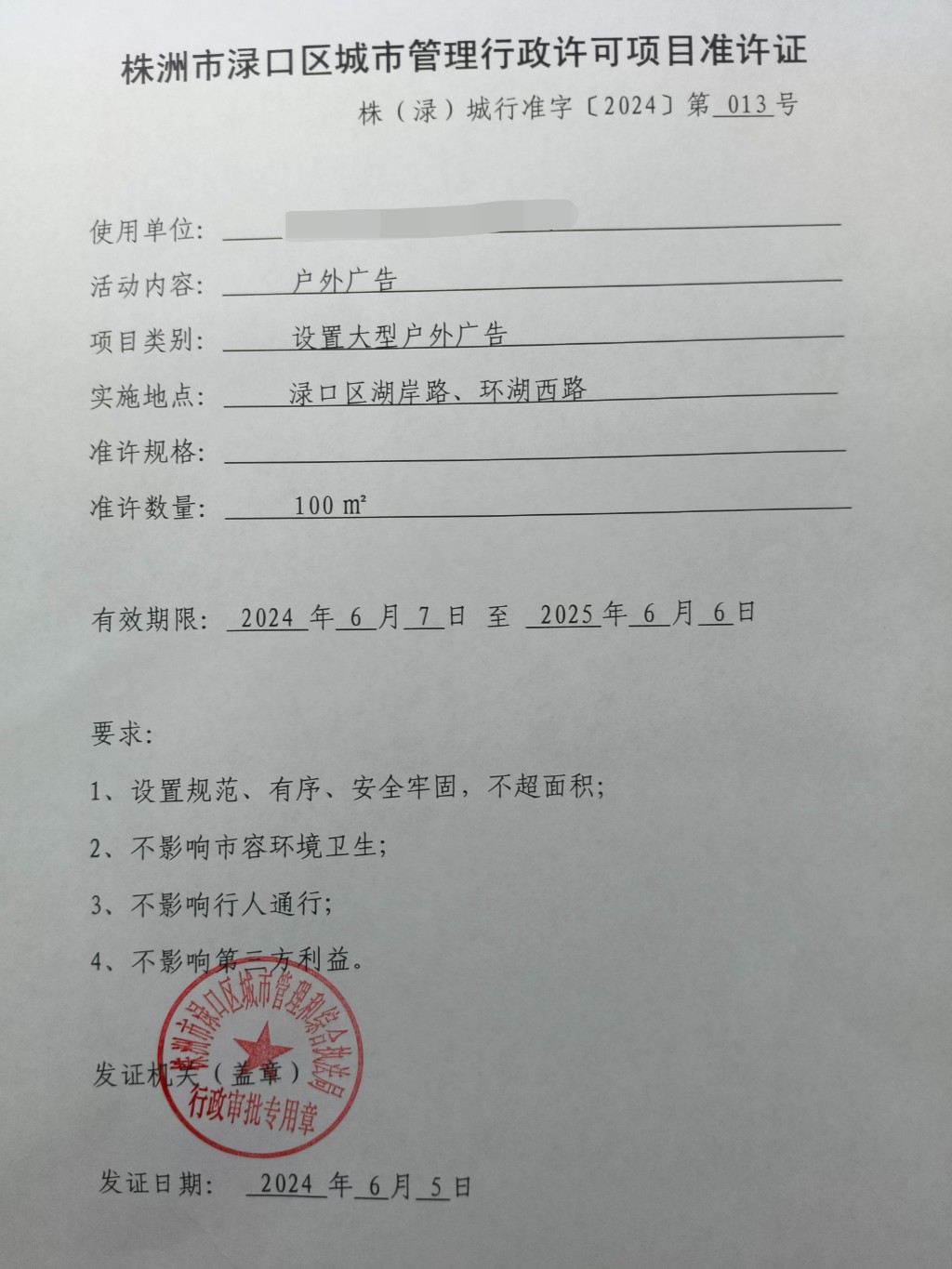 株洲市渌口区城市管理行政许可项目准许证株(渌)城行准字【2024】第013号