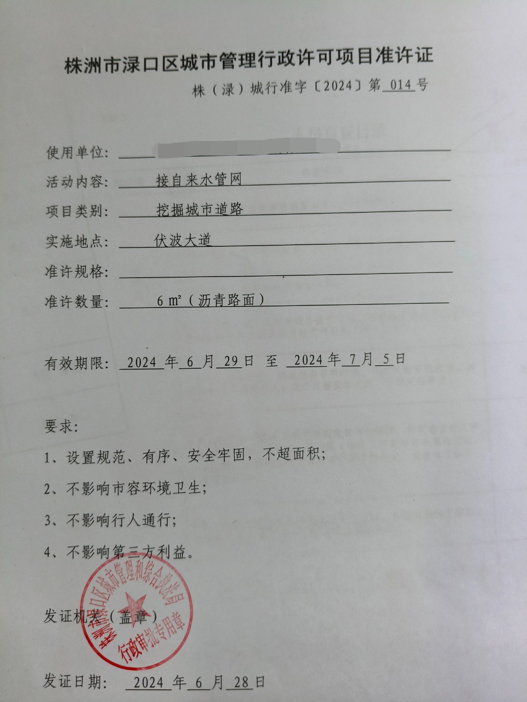 株洲市渌口区城市管理行政许可项目准许证株(渌)城行准字【2024】第014号