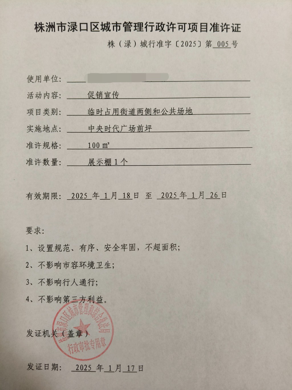 株洲市渌口区城市管理行政许可项目准许证株(渌)城行准字【2025】第005号