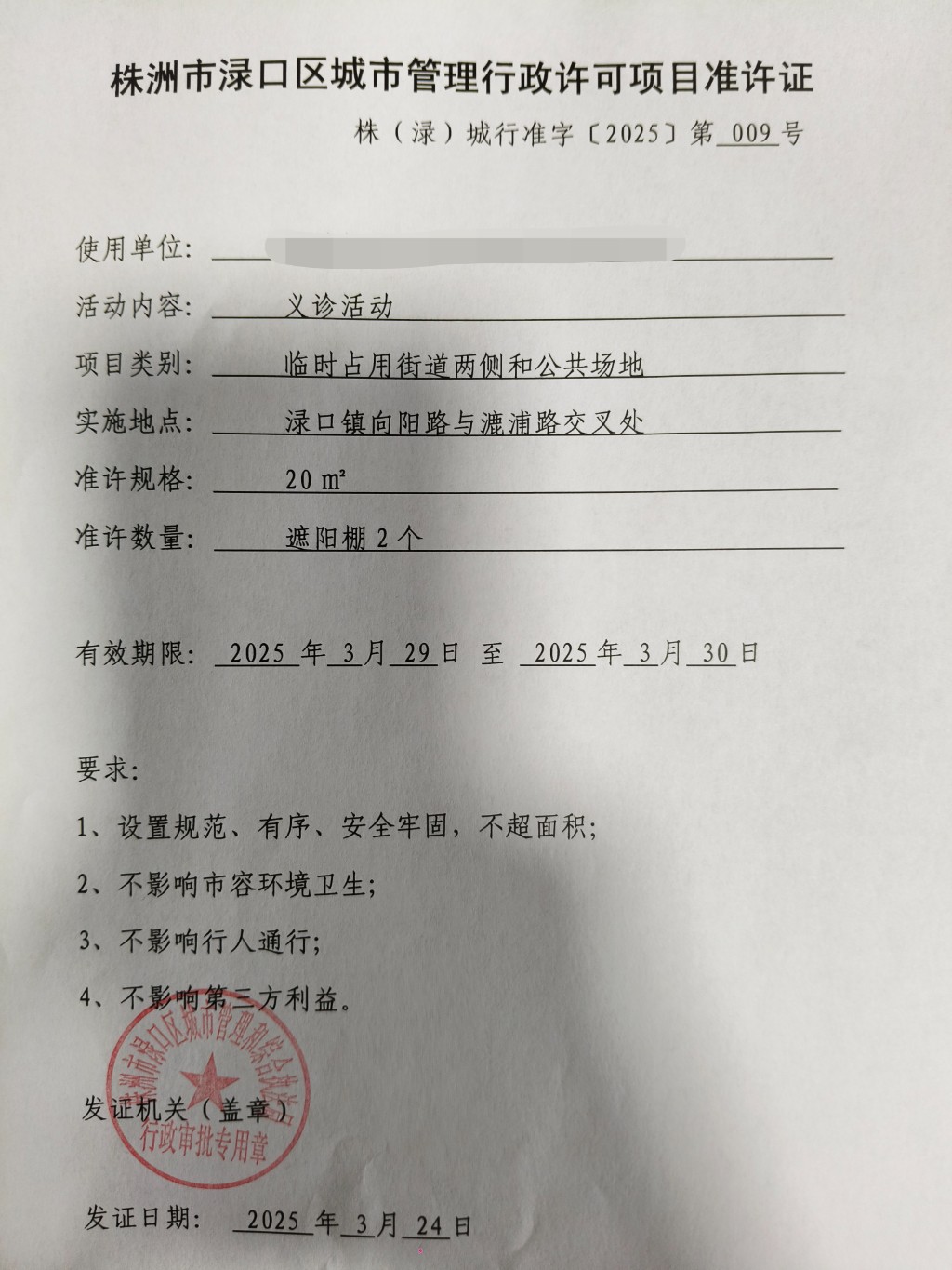 株洲市渌口区城市管理行政许可项目准许证株(渌)城行准字【2025】第009号