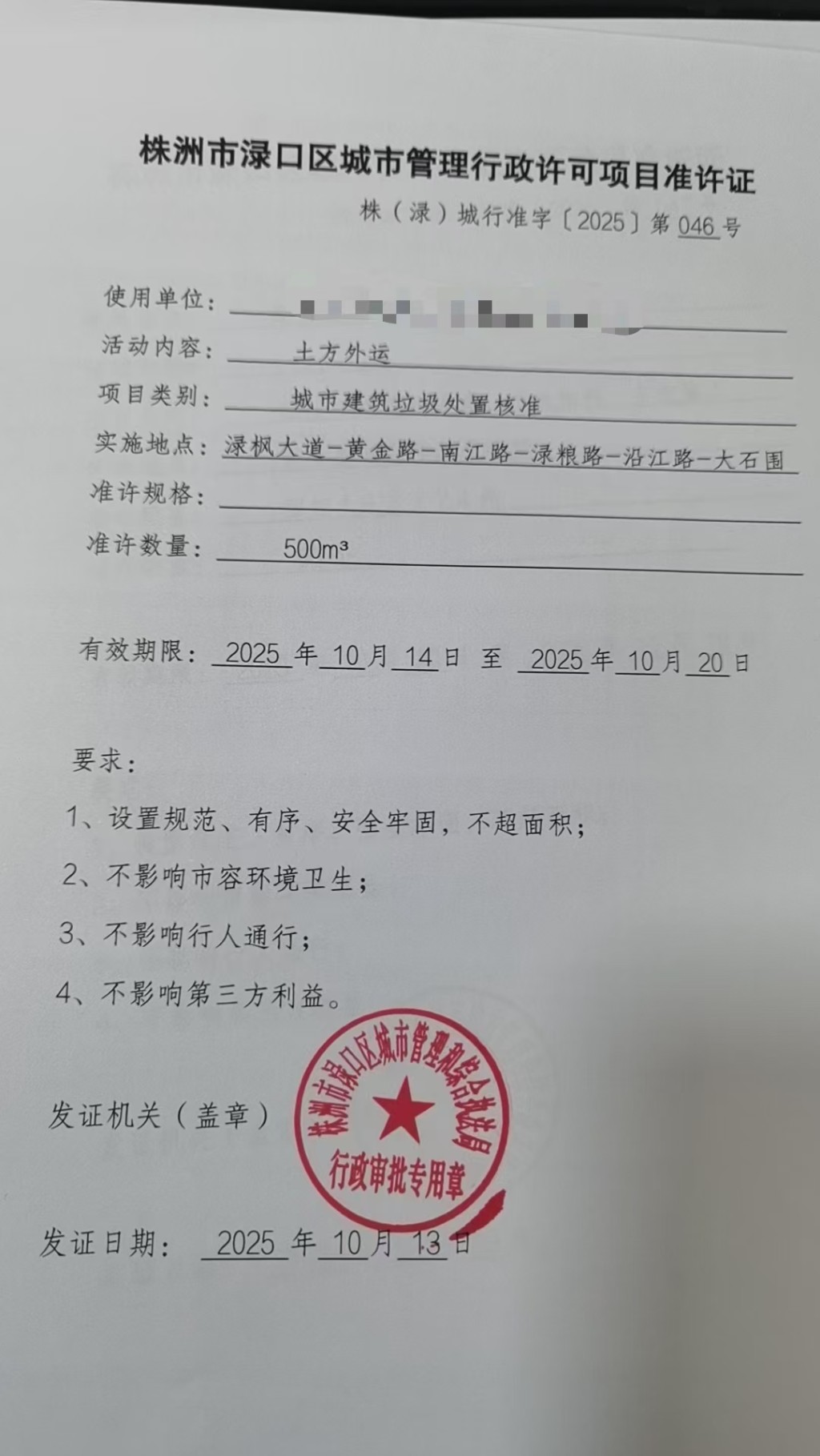 株洲市渌口区城市管理行政许可项目准许证株(渌)城行准字【2025】第046号