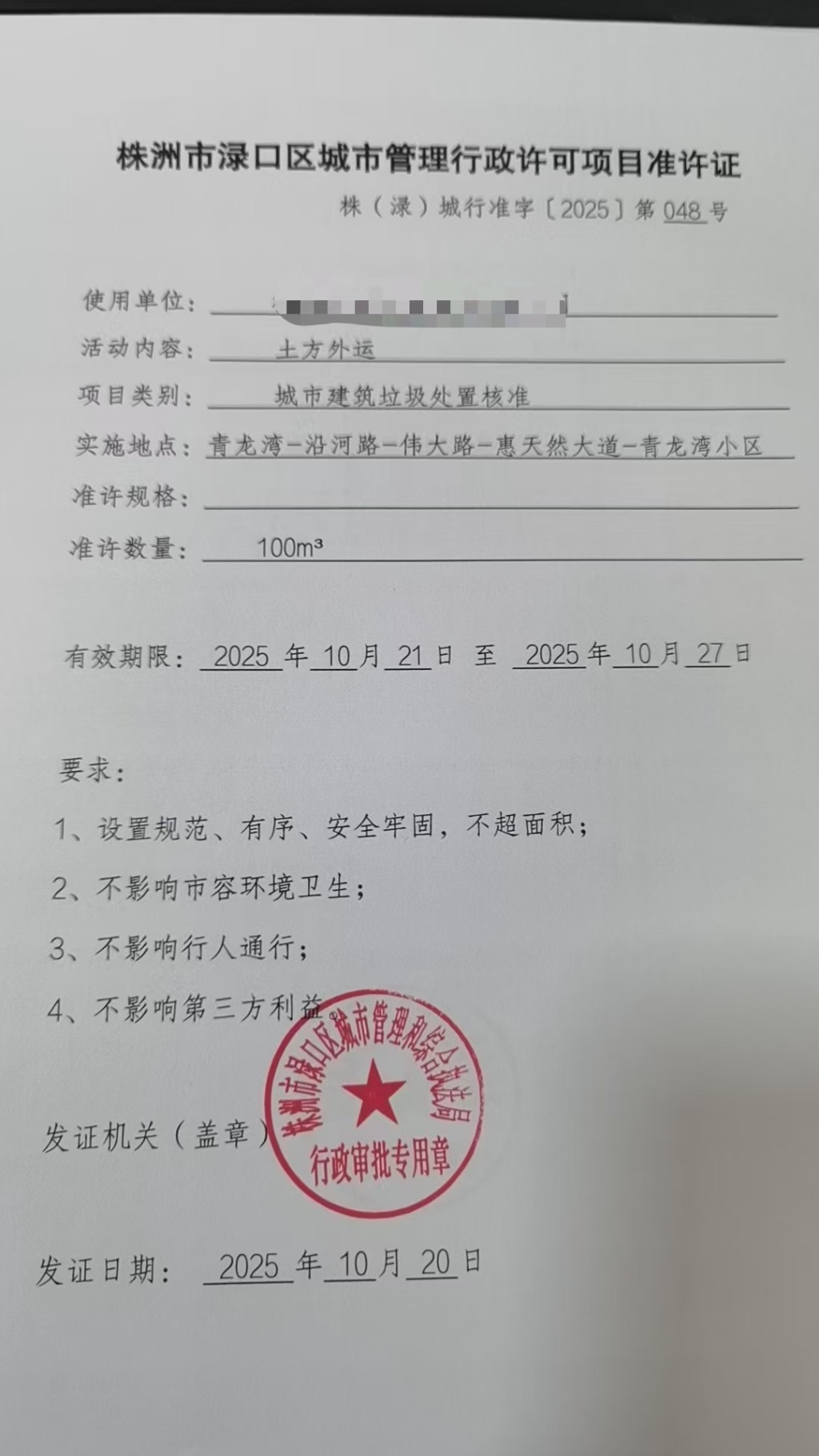 株洲市渌口区城市管理行政许可项目准许证株(渌)城行准字【2025】第048号