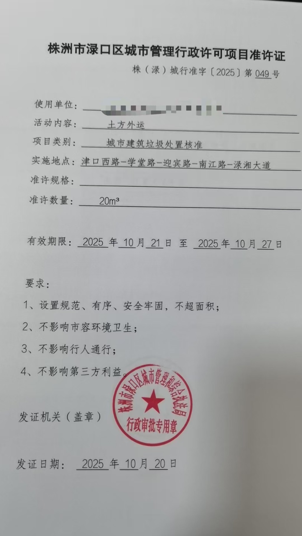 株洲市渌口区城市管理行政许可项目准许证株(渌)城行准字【2025】第049号
