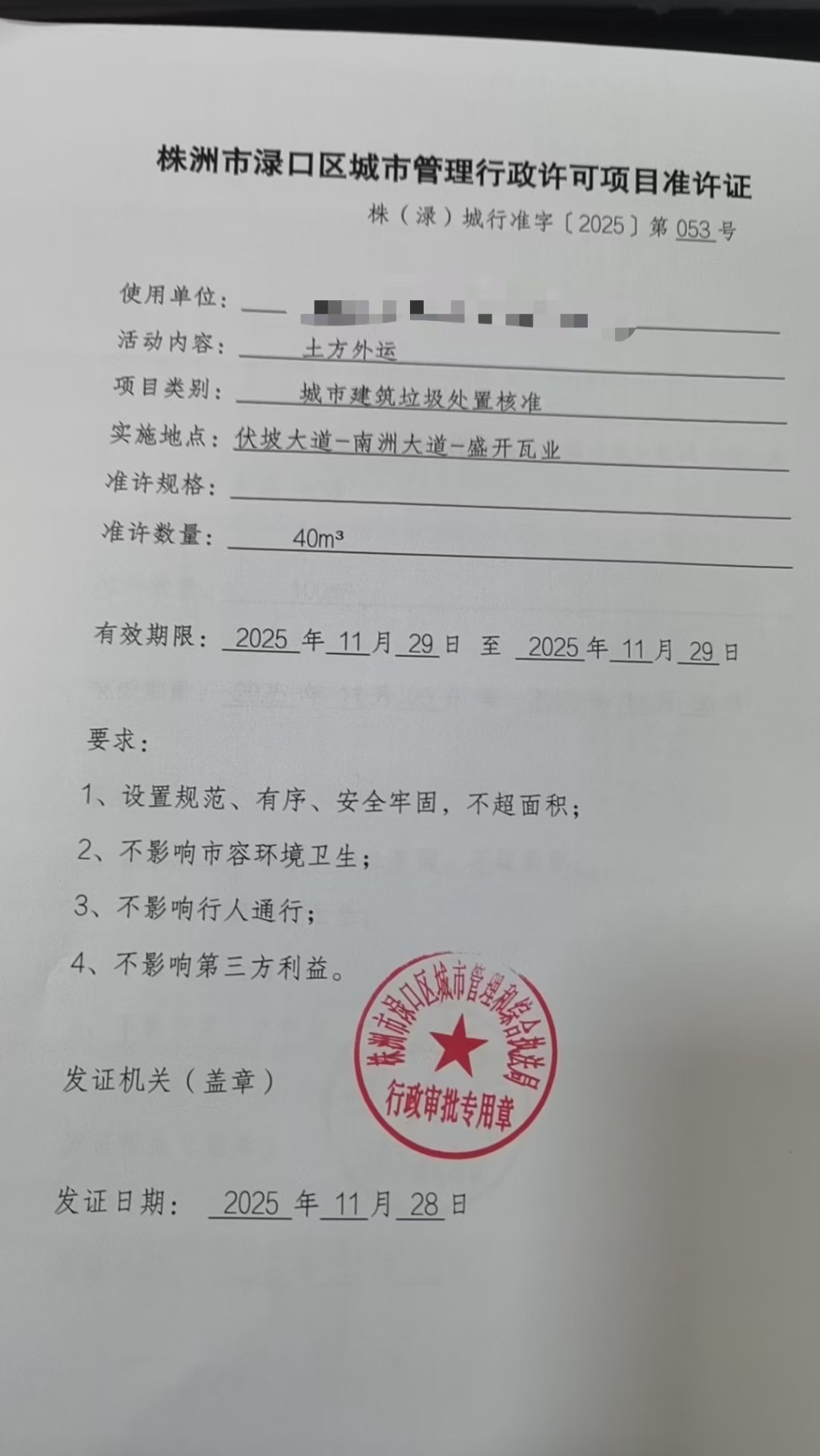 株洲市渌口区城市管理行政许可项目准许证株(渌)城行准字【2025】第053号