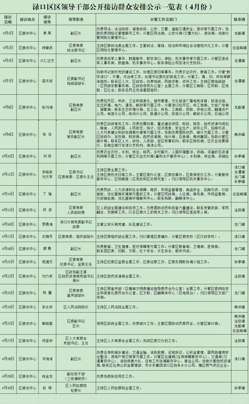 为畅通信访渠道,依法及时就地解决群众合理诉求,规范信访秩序,根据省、市要求,经区委、区政府同意,每个工作日由区领导轮流到信访部门公开接访,并实行区领导预约接访制度,现将2025年4月区领导接访安排公示如下