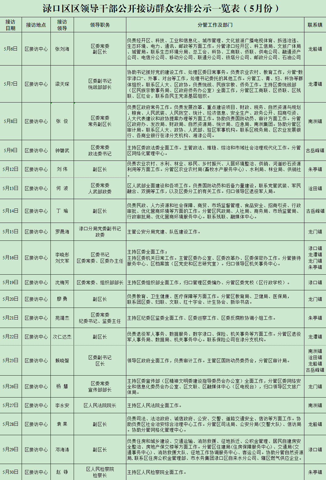 为畅通信访渠道,依法及时就地解决群众合理诉求,规范信访秩序,根据省、市要求,经区委、区政府同意,每个工作日由区领导轮流到信访部门公开接访,并实行区领导预约接访制度,现将2025年5月区领导接访安排公示如下: