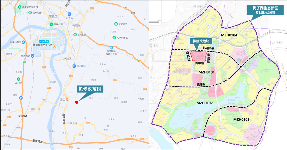 本次拟修改地块位于梅子湖生态新区01单元01街坊内,规划环湖中路、梅林路、梅洁路及湖水路围合区域,占地面积约5.16公顷(约77.34亩)。