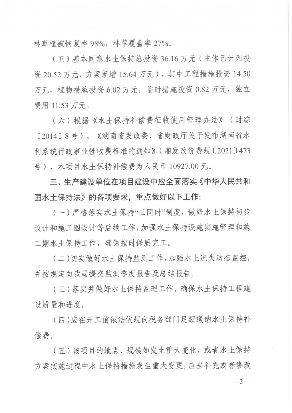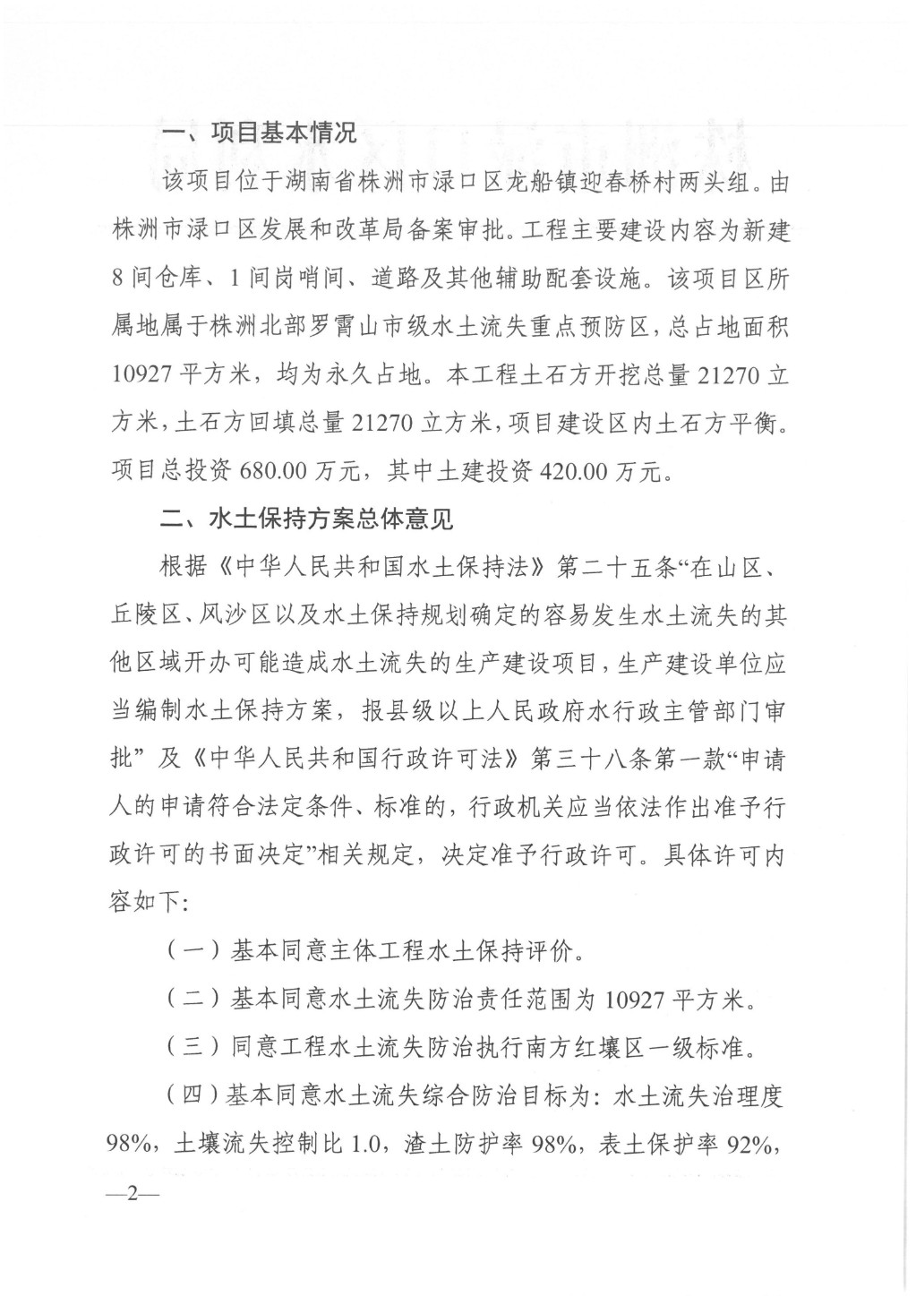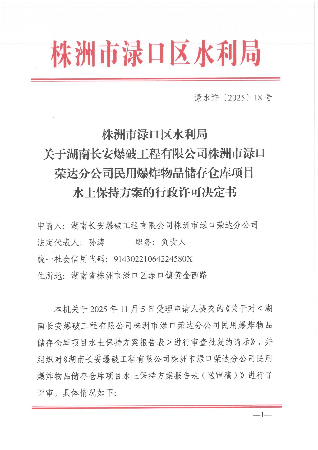 关于湖南长安爆破工程有限公司株洲市渌口荣达分公司民用爆炸物品储存仓库项目水土保持方案的行政许可决定书