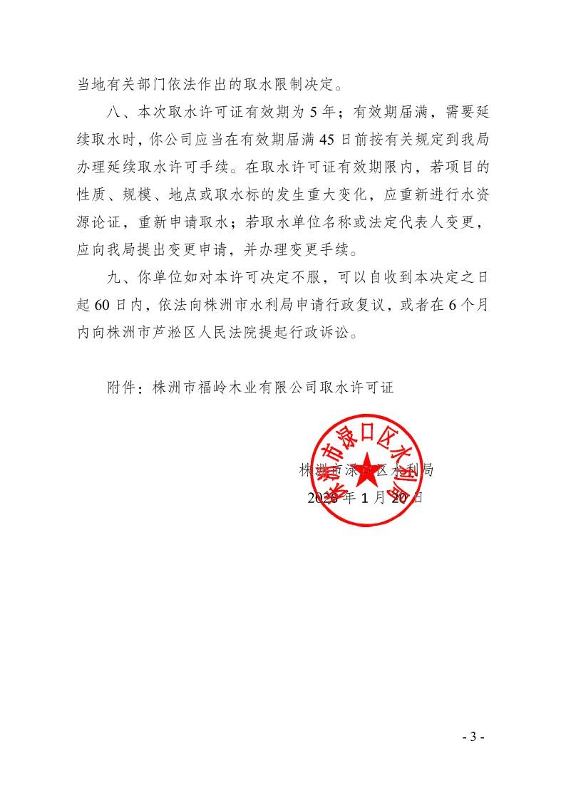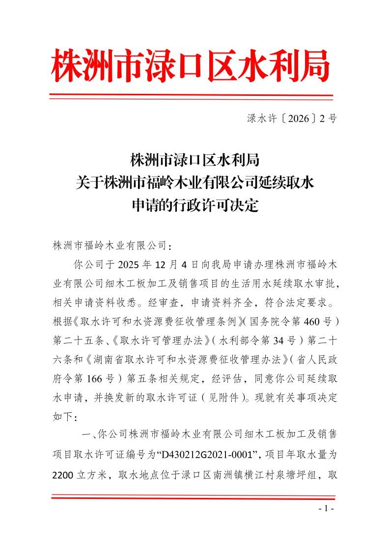 株洲市渌口区水利局关于株洲市福岭木业有限公司延续取水申请的行政许可决定