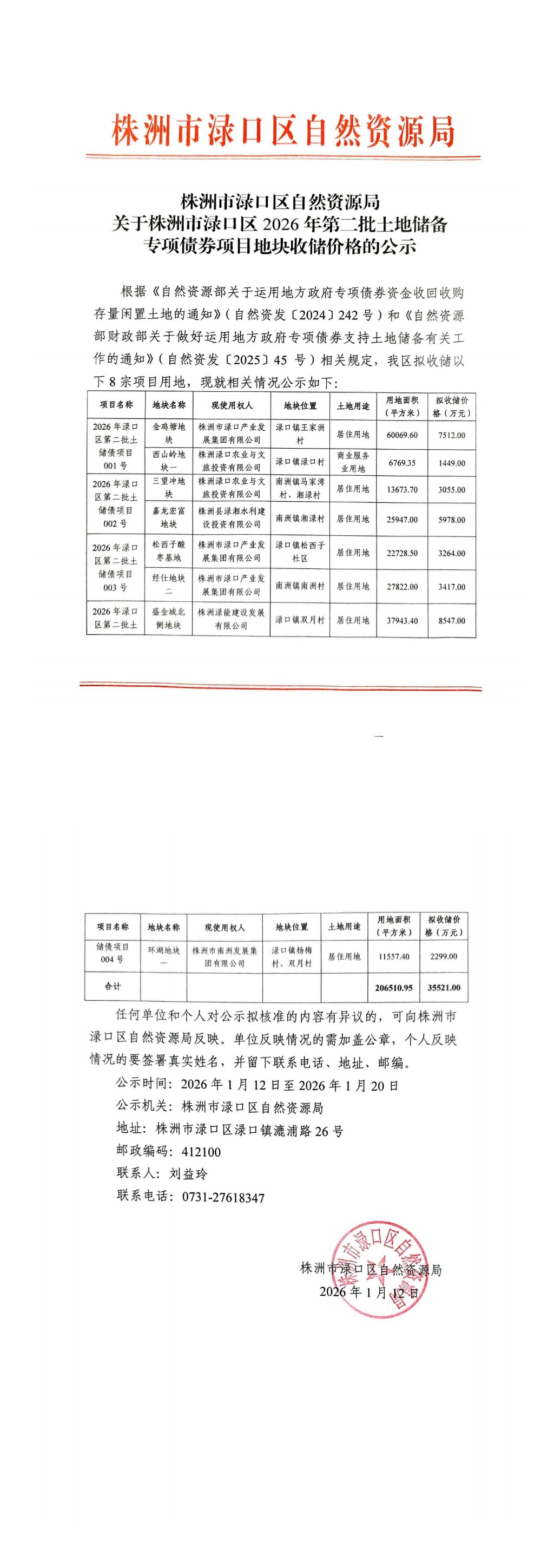 关于株洲市渌口区2026年第二批土地储备专项债劵项目地块收储价格的公示