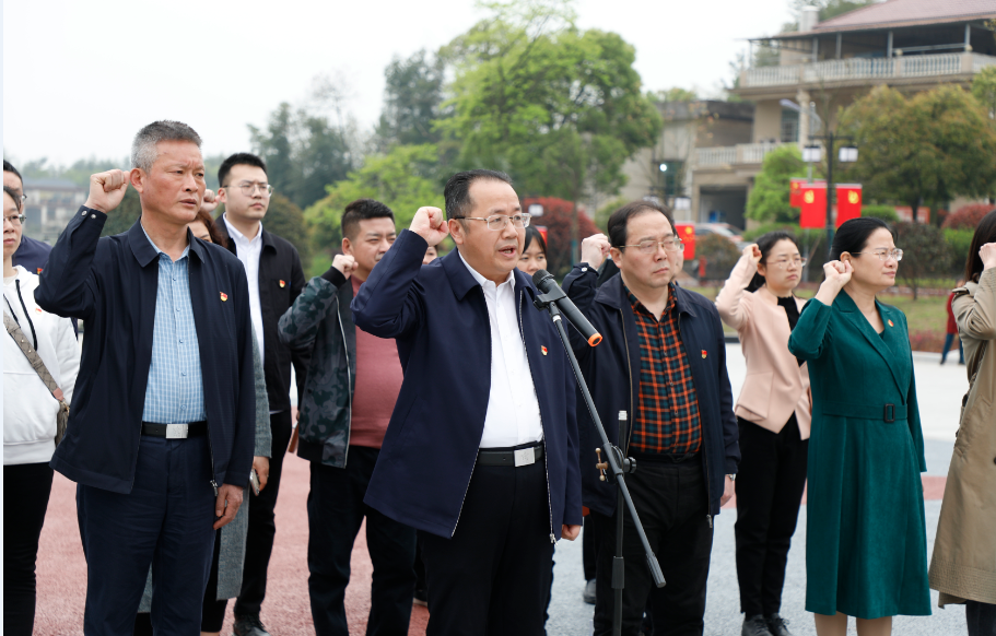 聂方红一行伫立在在杨得志将军铜像前,缅怀革命先烈,在他的带领下,全体党员整齐列队,面向鲜红的党旗,高举右拳,以饱满的精神状态、洪亮的声音重温入党誓词。