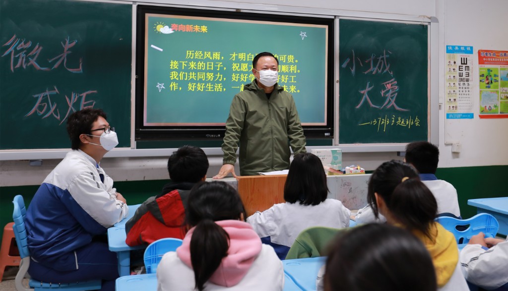 在渌口中学初三137班教室,教师杨俊正在给同学们上复学的第一课,他以“微光成炬,小城大爱”为主题,运用短视频讲解了新冠肺炎防控知识和抗击疫情期间发生的先进事迹。李晓彤与同学们一起认真地聆听了整堂课,他指出,在这场没有硝烟的战争中,区委、区政府始终将人民利益放在第一位,全区人民万众一心,众志成城,合力抗击疫情,涌现出了一大批抗疫先锋。特别是教育系统151位老师穿上防护服,助力核酸检测工作,给全区人民留下了深刻印象,也给同学们上了生动的一课。相信经过疫情的考验,同学们能努力做一个心中有感恩,肩上有责任,服务于人民,贡献于社会的新时代好青年。