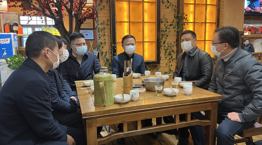 在南洲工业园漉浦饭店,赖晓智与企业家、相关部门负责人等围坐一起,清蒸草鱼、小炒红菜苔、羊肉火锅等本地特色美食陆续上桌,大家纷纷动筷,享受舌尖上的美食。