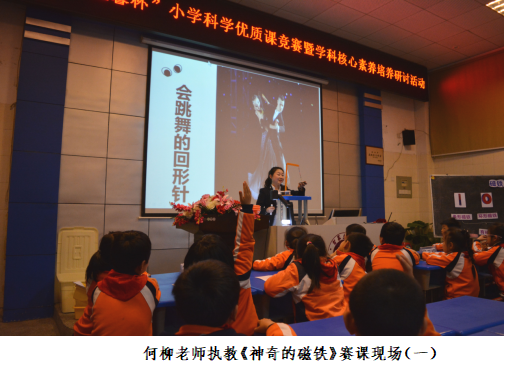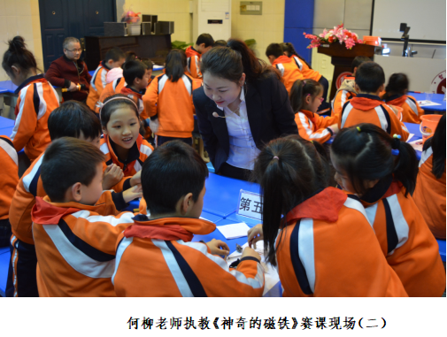 何柳老师参赛的课例是新编教材二年级下册《神奇的磁铁》。在充分了解学情、认真钻研教材、仔细解读课程标准的基础上,何老师以培养学生科学素养为宗旨,跨学科合理整合教材,精心设计探究活动,创设性地进行情境教学。在探究活动中,何老师不仅重视学生动手实验能力和概括能力的培养,更重视猜测与验证的对比和分析,引领学生做中学、学中思,培养学生严谨的科学实验态度。魔术导入后,何老师引导学生通过探究磁铁能吸引什么物体,初步建立"磁性"的概念。第二个实验探究环节,何老师深度挖掘教材,不断丰富探究的内涵,引导学生研究磁铁能否隔着物体吸铁。课堂上,学生始终怀着浓浓的好奇心进行自主探究,不时发出阵阵惊叹。