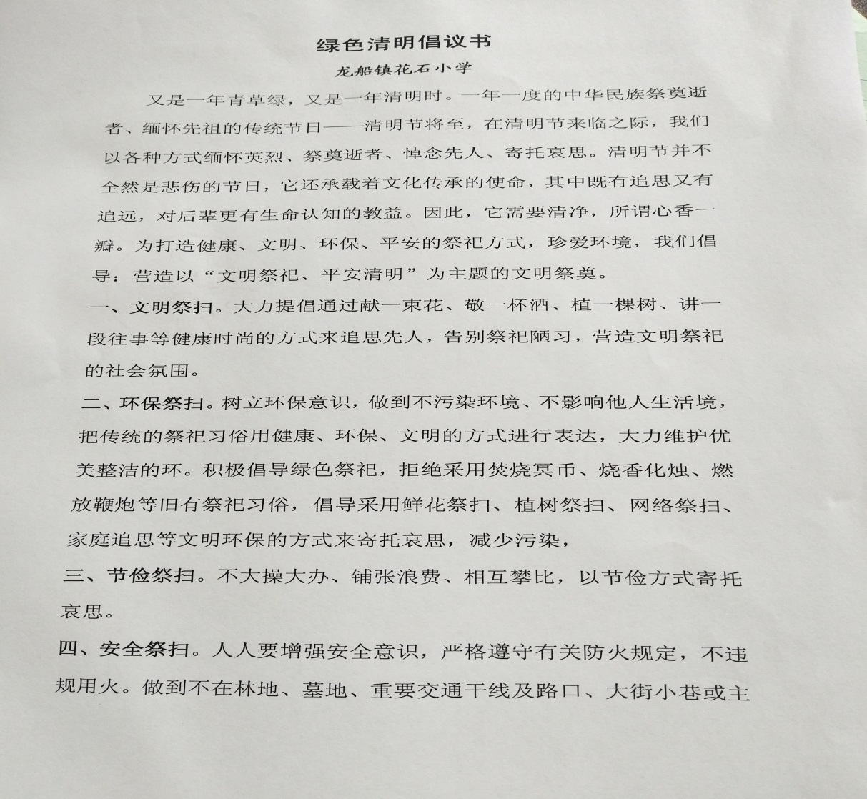 通过这次清明节的专题系列活动,花石小学的全体师生争做文明之风的倡导者和传播者,以移风易俗、低碳祭扫、文明祭祀的实际行动,保护绿水青山,共守美丽家园。