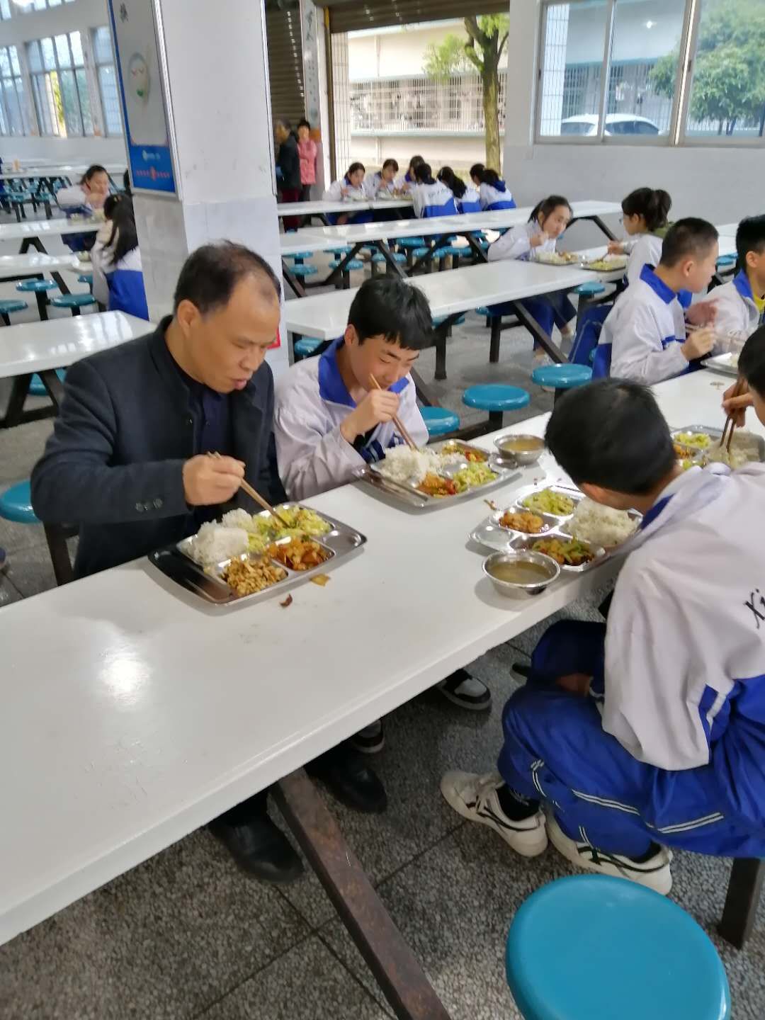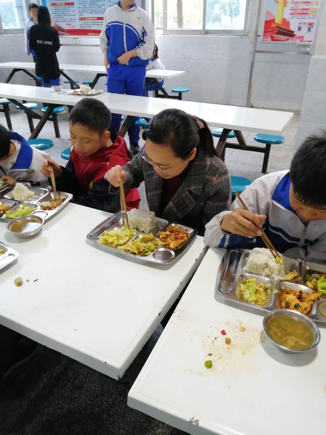 从每天的食品采购验收、菜品加工、食品留样、餐具消毒、储藏、食堂卫生清洁到食堂员工的健康检查,都环环到位。陪餐制度实施以来,校长、后勤负责人及老师每餐与学生一同就餐,发现任何小问题,及时处理,保证了同学们能吃上放心、可口的饭菜。