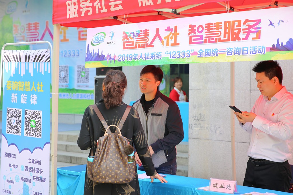 3月30日上午,“2019年人社系统12333全国统一咨询日”活动在市人社局人力资源市场前坪举行。12333是全国人力资源和社会保障部门代表政府向社会和人民群众宣传、解释人力资源和社会保障政策的公益性服务平台,今年统一咨询日活动的主题为“智慧人社 智慧服务”,各县市区同步开展宣传和咨询活动。