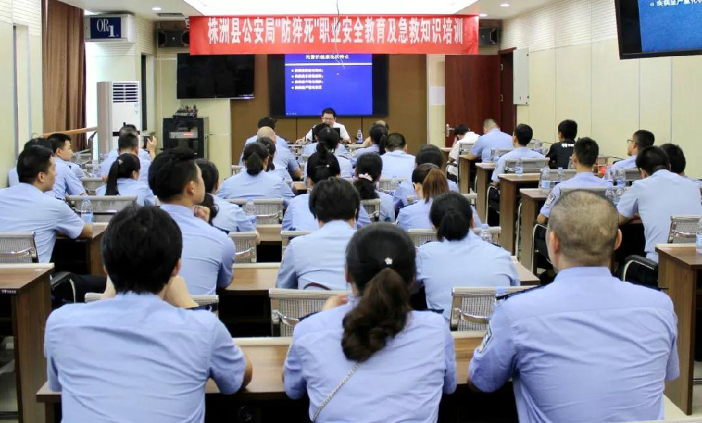 本次培训由重症监护学科(ICU)主任(副主任医师)陈志华授课讲解,课程分为健康知识、急救知识讲座和心肺复苏现场示教两部分构成。陈志华主任结合公安民警的职业特性,运用延伸案例,指出高危行业职工一定要重视亚健康状态,讲述株洲县公安民警加强健康自我保护的知识。医生们现场演示了徒手心肺复苏的操作技术和伤员搬运的正确方法。