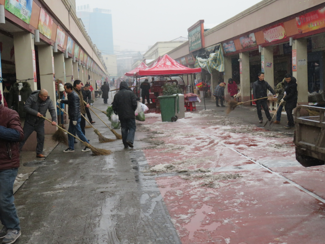 1、铲除市场内路面积雪,以免发生老百姓摔倒。