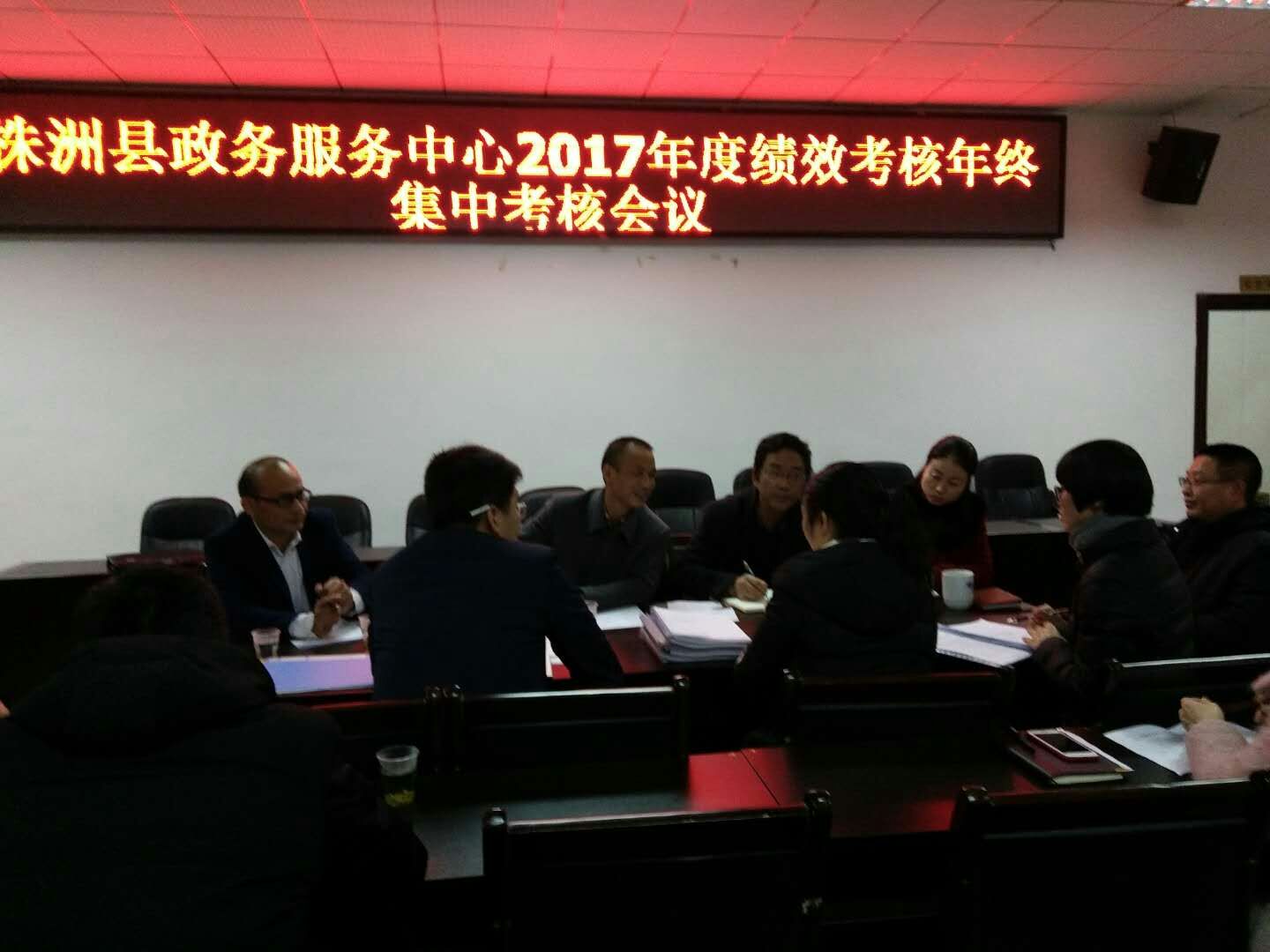 近日,县考核组一行来政务中心开展2017年度工作集中考核,并召开2017年绩效考核年终集中考核工作汇报会。县政务中心全体管理人员出席会议。