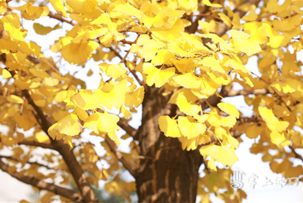 (金黄色的叶子委银杏树披上了一层明亮的外衣)