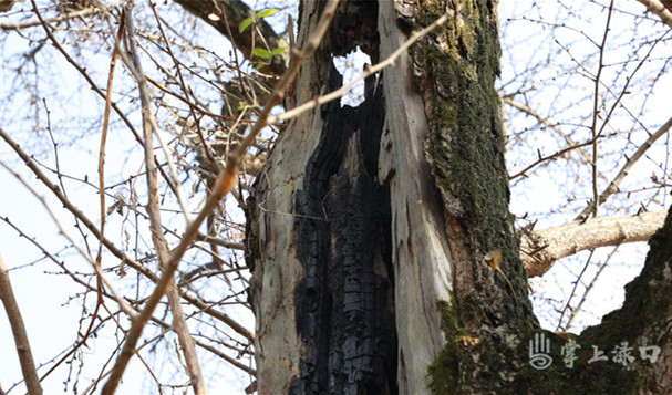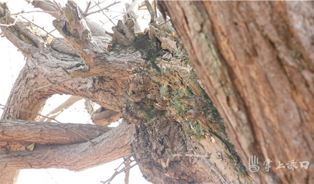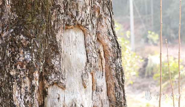 粗壮的树干需要两名成年人才能抱拢,一侧树皮早已剥落,露出了白色的树芯。