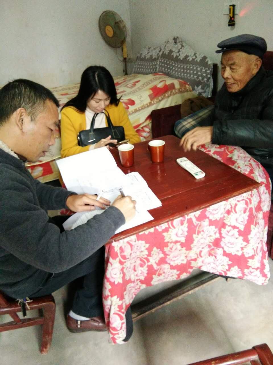 株洲县审计局副局长田丰收正在收集贫困户对于扶贫工作的评价和建议,向贫困户们宣传党和政府的惠民政策并开展贫困户满意度问卷调查,详细了解他们的身体健康状况及生活便利、危房改造等情况,鼓励他们树立信心,早日走上脱贫致富之路。