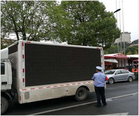 城管执法队员在检查广告宣传车手续是否齐全