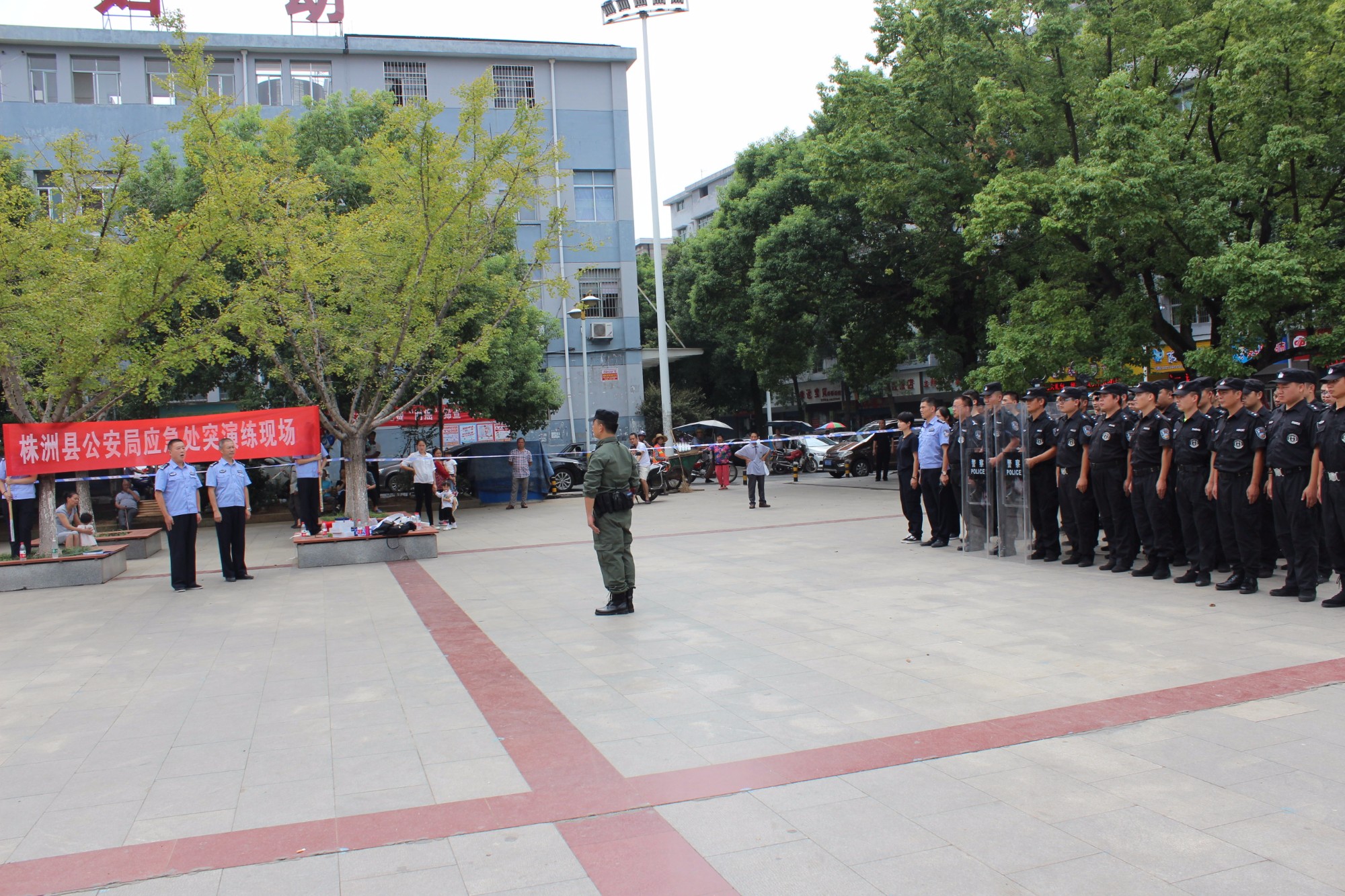 为扎实推进党的十九大安保维稳工作,提高公安机关应急处突快速反应能力,9月22日上午,株洲县公安局在县伏波广场举行了 “人流密集场所个人暴力砍杀事件现场处置”和“群体性事件处置”实战模拟应急处突演练。县人民政府副调研员、局党委副书记、政委董智,局党委委员、副局长赵伟平在演练现场全程观摩督战。