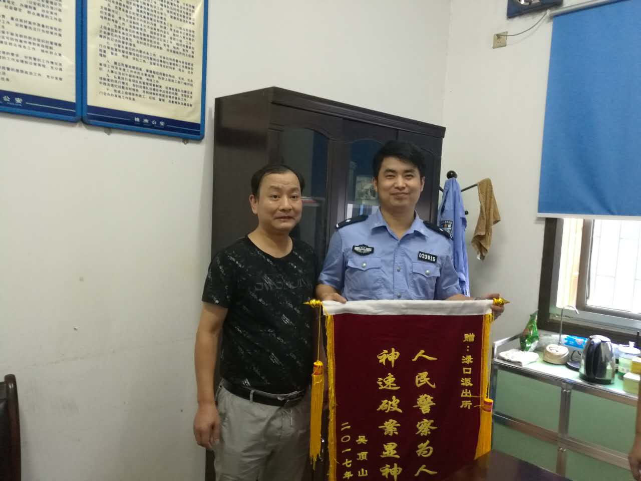 2017年9月13日上午,吴岭山怀着十分激动的心情将一面鲜艳的锦旗送到渌口派出所值班室,并指名要送给渌口派出所副所长胡荣。