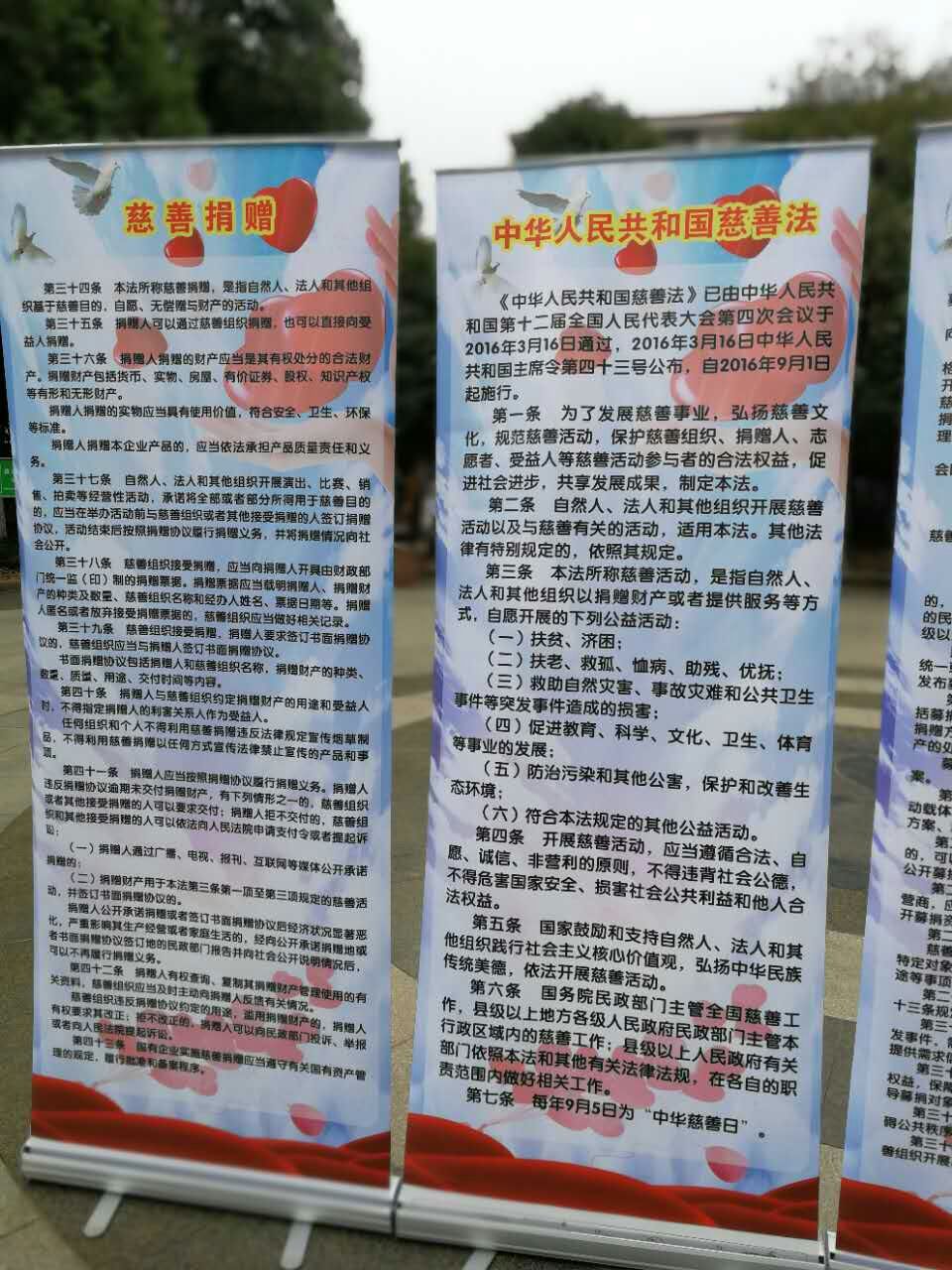 今年9月1日,《慈善法》已正式施行一周年,9月5日,是第二个“中华慈善日”。为此,县慈善办主任凌国强带领工作人员于9月5日在县向阳广场开展慈善日宣传活动。活动中利用展板、横幅、易拉宝、宣传折页等形式向广大群众宣传慈善法,活动当日向市民群众免费发放宣传资料4000余份。