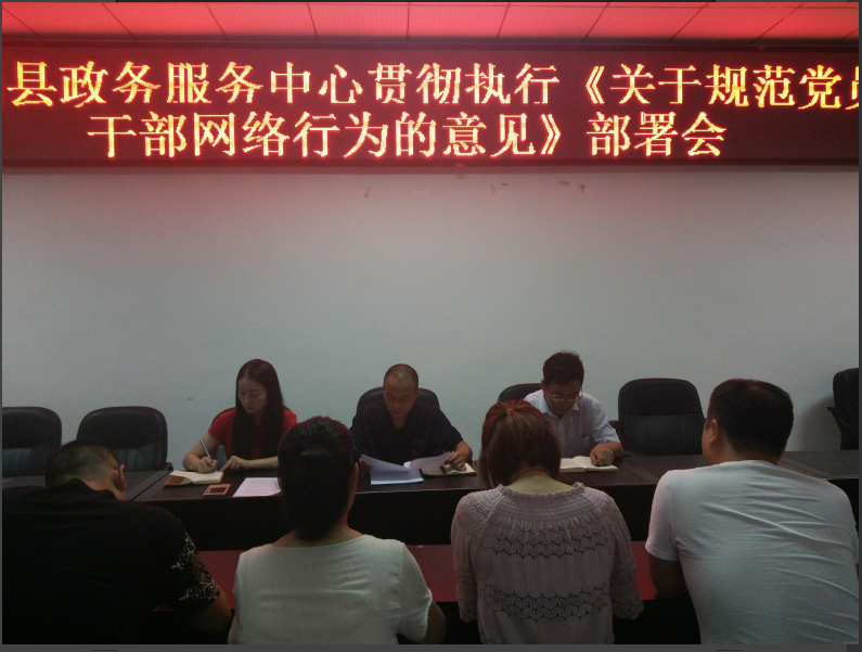 8月28日下午,县政务中心召开全体管理人员会议,罗胜利主任组织大家认真学习了县委宣传部、县委组织部联合下发的《关于规范党员干部网络行为的意见》,罗主任要求大家要充分认识到网络行为是党员干部言行的重要组成部分,党员干部要发挥模范带头作用,严守政治纪律和政治规矩,走好网上群众路线,规范网络行为,促进形成健康向上、风清气正的网络环境。
