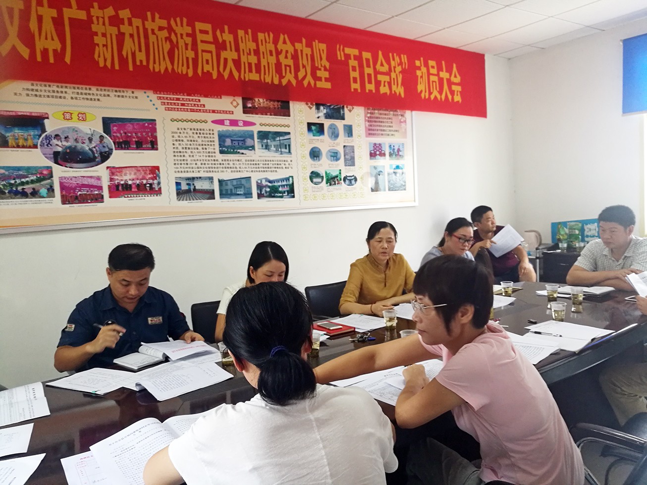 8月21日上午,株洲县文体广新和旅游局在机关会议室召开决胜脱贫攻坚“百日会战”动员大会,会议由党组书记、局长唐欣荣主持。