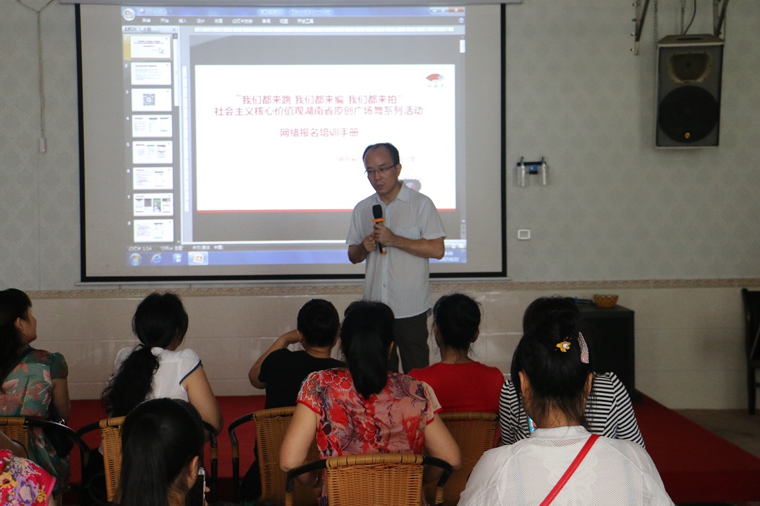 6月22日,株洲县文化馆组织开展2017年社会主义核心价值观湖南原创广场舞大赛网络报名培训活动。活动邀请3名红扇子广场舞俱乐部技术员到现场进行指导讲解。县内各广场舞队伍领队和骨干完成了视频、图片等资料的摄制上传及投票工作。