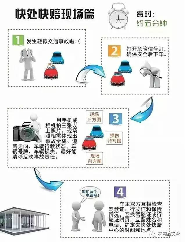 今后,凡在株洲县辖区道路上发生机动车之间财产损失在2万元以内、无人员伤亡的交通事故,且车辆手续齐全,保险在有效期内,事故当事人在事故发生后48小时内,可以自行现场拍照取证、互留对方身份信息和联系方式后,约定时间,携带驾驶证、行驶证、车辆保险单及事故现场照片和视频资料,共同驾驶事故车辆前往快处快赔中心处理。