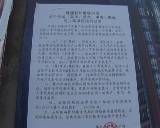 高考前,县环保局工作人员就对考生住宿点周围的工地、经营业主进行了宣传,张贴了关于考试期间防止环境污染的公告,要求他们不要制造噪音,以免影响考生休息;考试期间,县环保局还将派出两组工作人员,在考场附近进行巡查,严禁居民和经营者产生噪音。