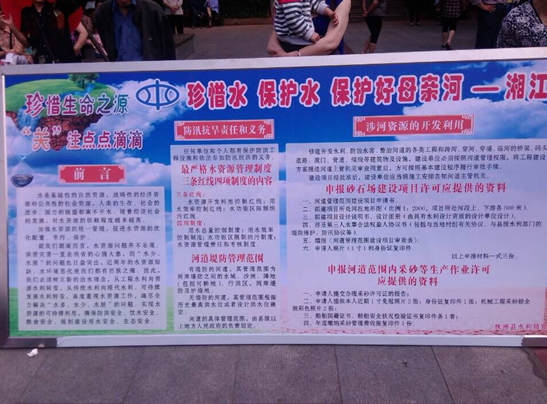 宣传板报以“珍惜水、保护水、保护好母亲河—湘江”为主题,列出了群众生活当中常常与水法挂钩的内容;宣传资料包含了几部最重要、最常用的水法,《河道管理条例》、《湘江保护条例》、《防洪法》等,“河道采砂”成为群众关注的热点,群众提出了如何申报、怎样开采才算合法等问题,水利部门的工作人员都耐心的进行解答,让每个咨询的群众都得到了满意的回复。