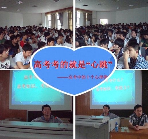 许校长谈到,高考就是考智慧,知识+能力+素质=智慧。知识、能力在高考决战中是属于战术和技术层面上的要素,而素质则是属于战略和思想层面上的要素,前者是基础,后者是关键。拥有好的素质,必然心态沉稳,站得高,看得远。一般来说,考生考前在知识和能力上不会再有什么变化,但素质上、尤其是心理素质上的差异将在考试中起决定性的作用,它直接影响知识和能力的有效应用和发挥。许校长还通过一些鲜活、典型案例分析细致地引导学生如何去营造积极的情绪和良好的心理,他希望同学们要拥有高考视角:高考对每个人都是一次可取的机会;考试中不要苛求科科圆满,但求考好一科是一科;考试中不要奢望题题做完,但求会做的都做对。最后,许校长着重对高考中,同学们可能会遇到的心理问题一一做出解答,在现场还教同学们几招缓解压力,放松心情的的方法,并热情地鼓励同学们勇敢的迎接即将到来的高考。