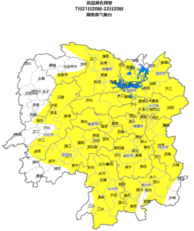 湖南省气象台07月21日16时发布高温黄色预警:21日20时至22日20时,长沙、株洲、湘潭、衡阳、邵阳、岳阳、常德、张家界南部、益阳、郴州、永州、怀化东部、娄底将达到35℃以上高温,局部地区将达37℃以上,请做好防范。