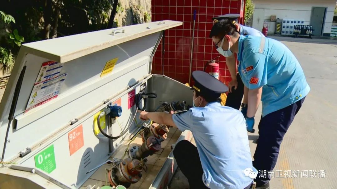 在这家加油站 ,执法人员检查卸油口各个阀门、卸油注意事项提示牌和消防器材间是否准备到位,再检查地下油罐储存的密闭性 。
