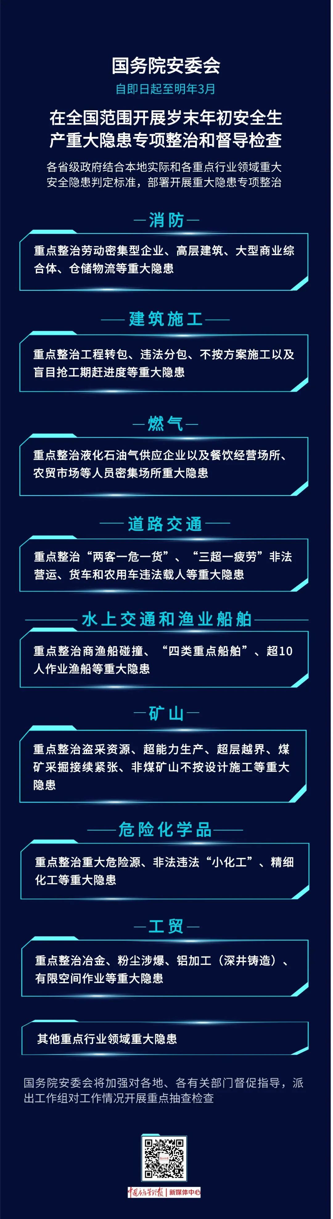 国务院安委会启动岁末年初全国安全生产重大隐患专项整治和督导检查,要求各省级政府结合本地实际和各重点行业领域重大安全隐患判定标准