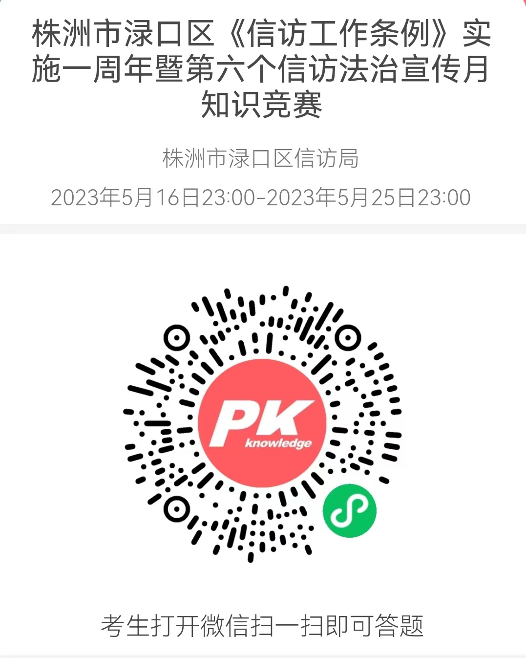 为深入学习贯彻习近平总书记关于加强和改进人民信访工作的重要指示批示精神,宣传、推广《信访工作条例》,进一步提升《条例》知晓度,提高信访干部业务能力,增强群众依法信访意识,引导广大干部群众对《条例》规定入心入脑、见行见效。5月16日至5月25日,株洲市渌口区信访局开展《信访工作条例》实施一周年暨第六个信访法治宣传月知识竞赛活动,在全社会营造办事依法、遇事找法、解决问题用法、化解矛盾靠法的良好环境,为建设“青春渌口、创业新城”贡献力量。
