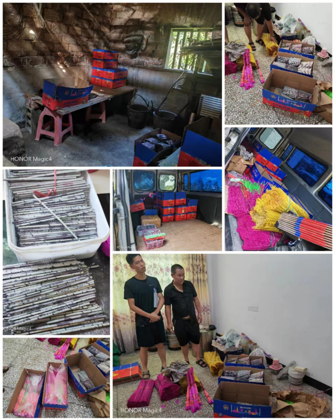 2023年7月10日,接南洲镇应急办负责人提供的相关线索,渌口区应急管理局与南洲镇应急办联合查处在南洲镇早竹村民房内非法手工加工"财神棒"(俗称"狗尾巴草")烟花的两处。