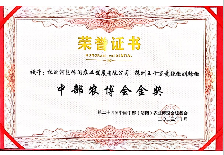 株洲河包休闲农业发展有限公司作为“株洲王十万黄辣椒”国家地理标志证明商标授权使用经营主体,携其优质农产品参加了本次展会。展会期间,“株洲王十万黄辣椒”剁辣椒凭借辣、香、脆、甜等特点和品牌优势,受到消费者的青睐,通过与参展企业同台竞争、激烈角逐和专家组评审,成功斩获2023年中部农博会金奖。