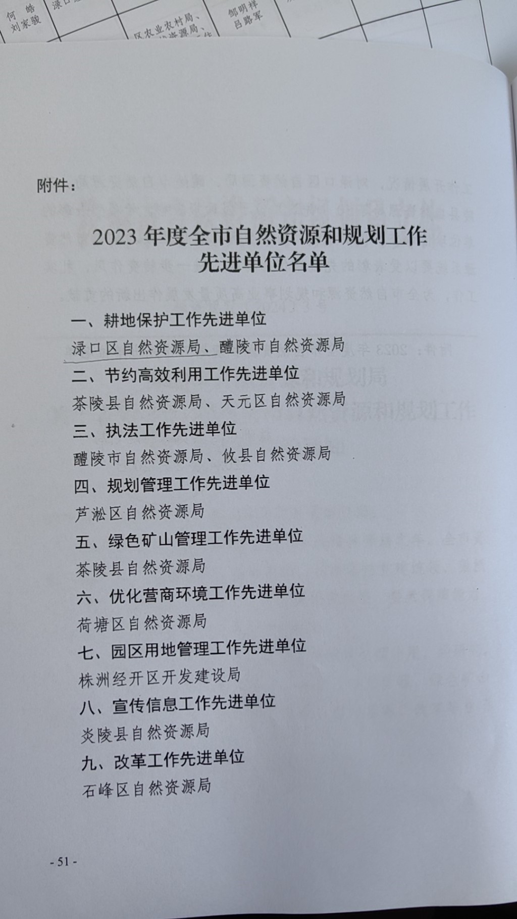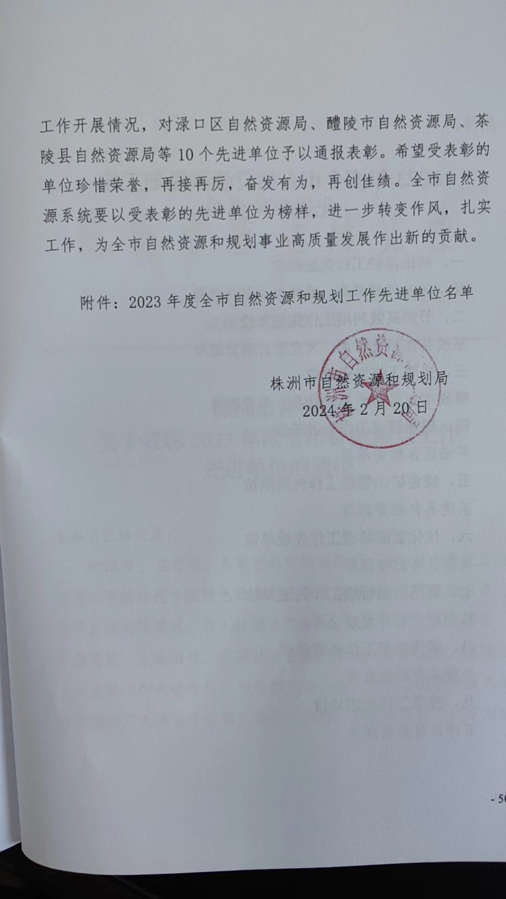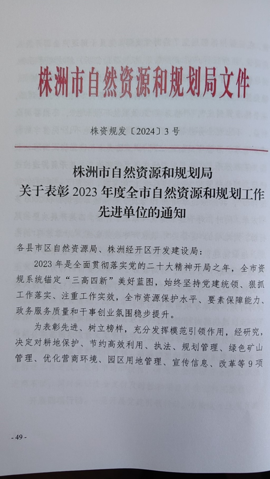 近日,市自然资源和规划局印发《关于表彰2023年度全市自然资源和规划工作先进单位的通知》对2023年度在全市自然资源和规划工作表现突出的单位给予通报表彰,渌口区自然资源局获评2023年度全市自然资源和规划工作先进单位
