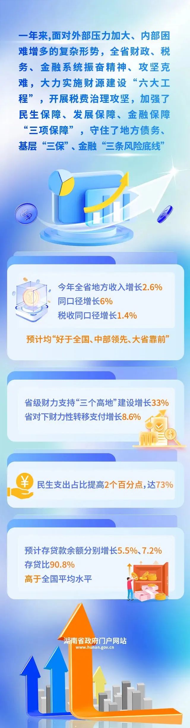 今年全省地方收入增长2.6%、同口径增长6%,税收同口径增长1.4%,预计均“好于全国、中部领先、大省靠前”;省级财力支持“三个高地”建设增长33%、省对下财力性转移支付增长8.6%;民生支出占比提高2个百分点,达73%;预计存贷款余额分别增长5.5%、7.2%,存贷比90.8%,高于全国平均水平。