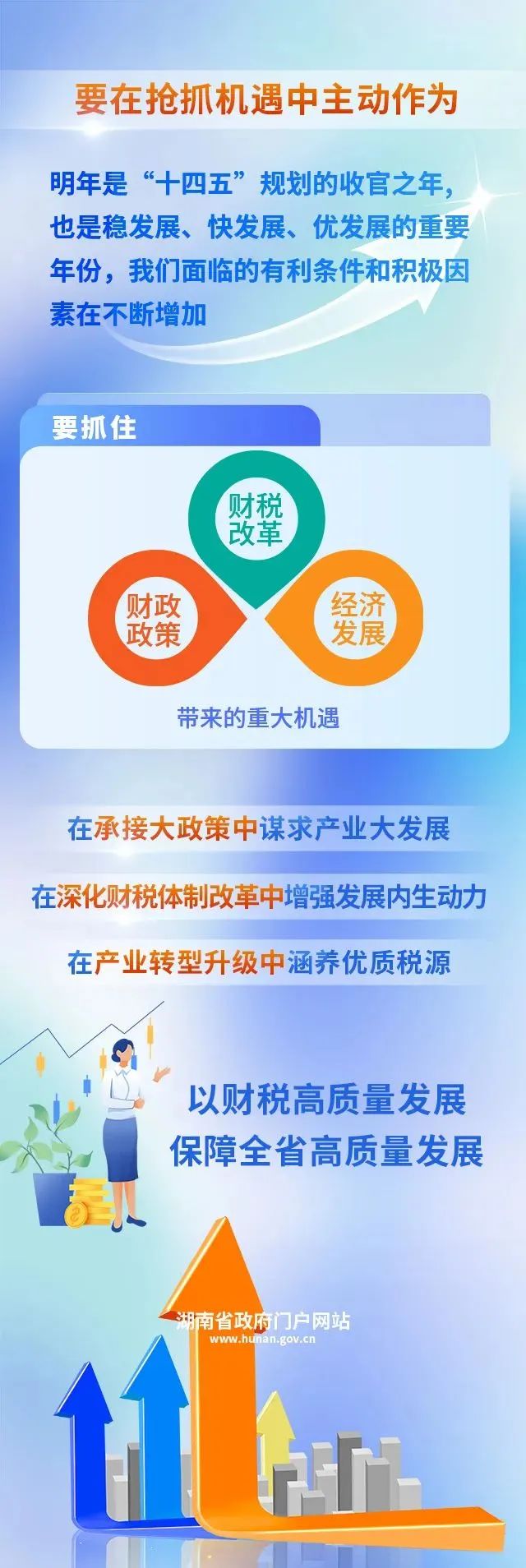 会上,省财政厅、省税务局、中国人民银行湖南省分行主要负责人汇报了2024年全省财税收入、金融等情况。毛伟明对全省财税金融工作成绩给予充分肯定,并向广大干部职工致以新年祝福。